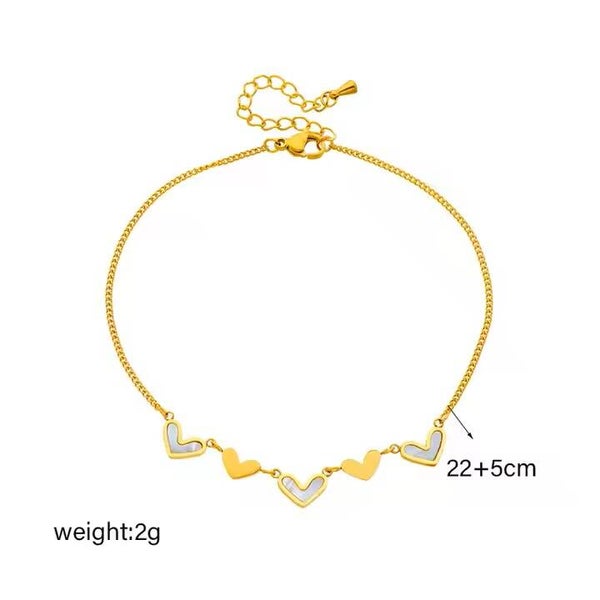Discover the charm of our Non-Tarnish 18k Gold Plated Stainless Steel White Heart Anklet, designed for women who value elegance. With a base length of 22 cm and a 5 cm extender, it offers a customizable fit. Made from high-quality stainless steel, this anklet is stylish and resistant to tarnishing. The genuine white oyster shell heart adds sophistication, making it perfect for any outfit. An essential piece to elevate your jewellery collection!