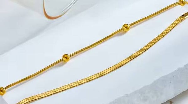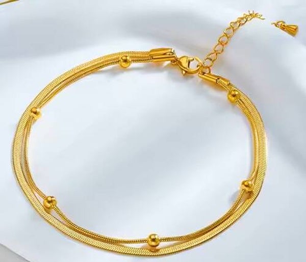 This elegant non-tarnish 18k gold-plated stainless steel double-layer bead anklet is designed for women who appreciate refined jewelry. With an original length of 22 cm and a 5 cm extender, it offers a customizable, comfortable fit. Its durable construction ensures it remains shiny over time, making it perfect for both special occasions and everyday wear. An excellent addition to any jewelry collection.